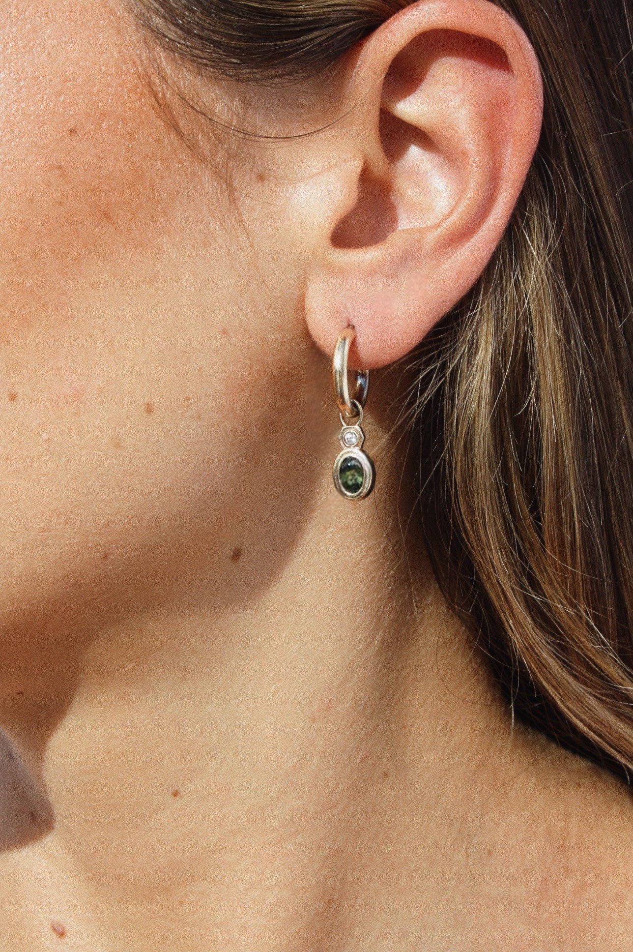 The Orbit Drop Hoop is a handcrafted earring featuring a sleek and elegant design. Made with 14k yellow gold and Sterling Silver, this earring showcases a natural oval sapphire, its deep and captivating hue adding a touch of luxury. Above the sapphire, a sparkling cubic zirconia provides a brilliant contrast, enhancing the overall allure. The sapphire is securely set in a polished gold frame that dangles from a classic hoop, giving the earring a graceful movement. The combination of these elements creates a sophisticated and timeless piece that can elevate any look.